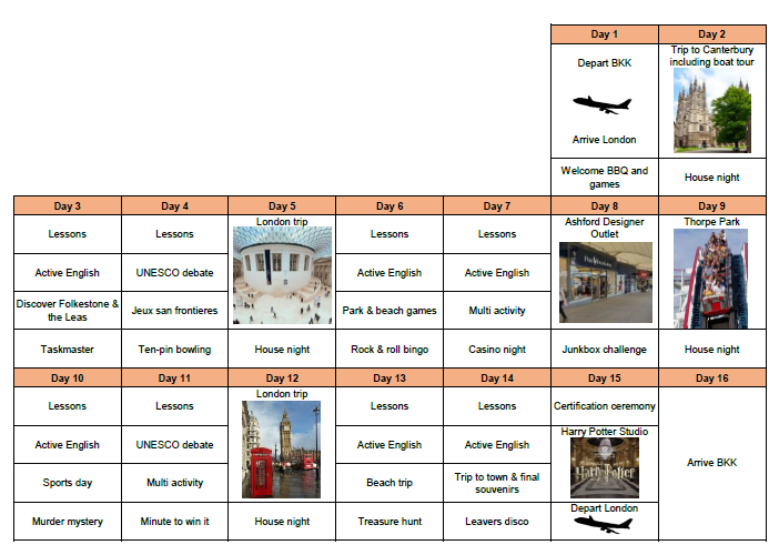 - มีครูชาวไทยเดินทางไปกับนักเรียน และคอยดูแลนักเรียนตลอดเวลา ซึ่งผู้ปกครองสามารถติดต่อครูชาวไทยได้ตลอด 24 ชม.