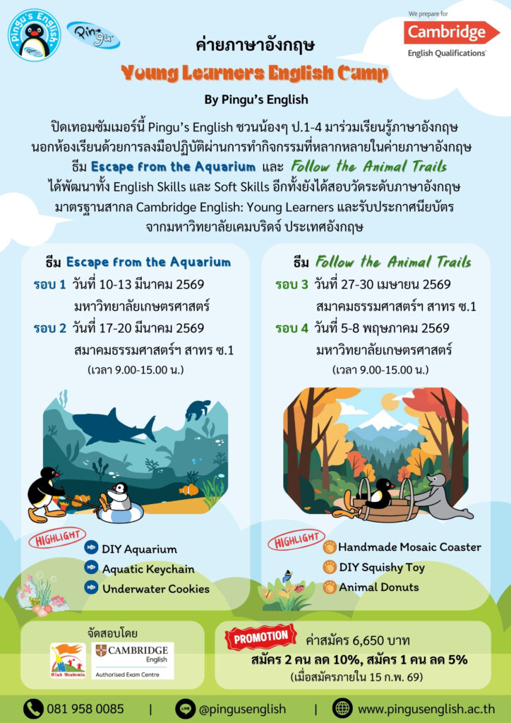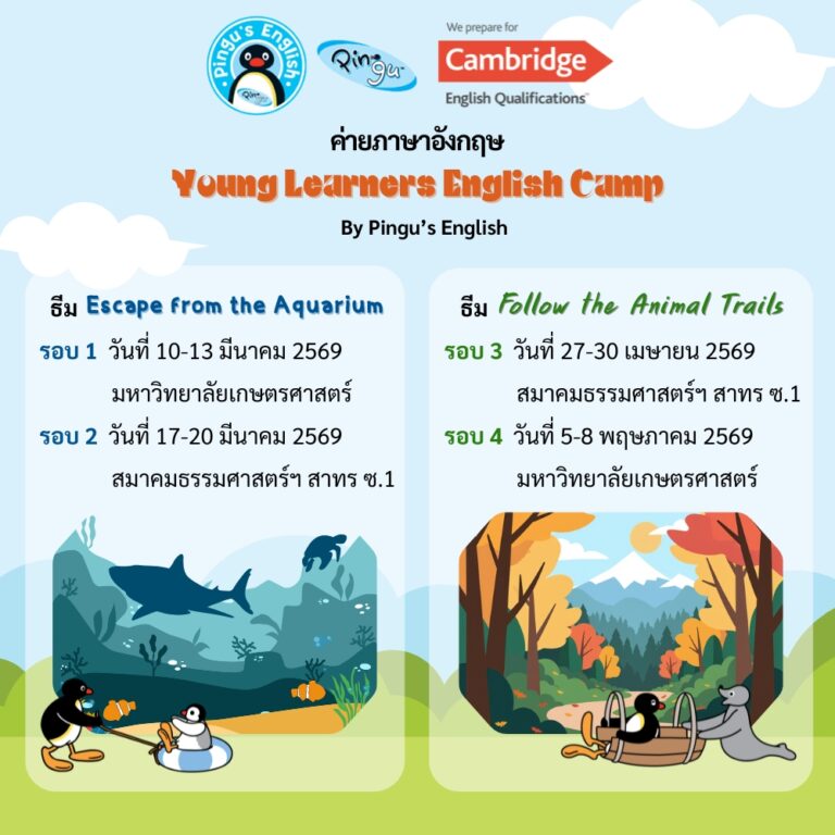 ค่ายภาษาอังกฤษ Young Learners English Camp by Pingu’s English ตอน Escape from the Aquarium และ Follow the Animal Trails สำหรับน้องๆ ป.1-4 เพื่อเรียนรู้ภาษาอังกฤษนอกห้